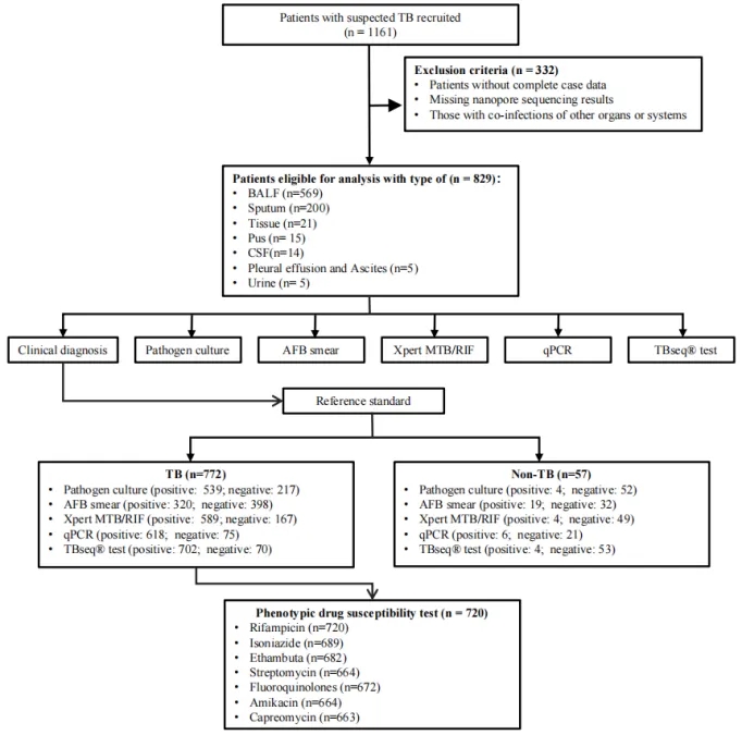 本研究招募了來自6家結核病定點醫(yī)院的1161例疑似結核病患者,經篩選后納入829例進行后續(xù)分析。通過對比M.tb培養(yǎng)、AFB涂片、Xpert MTB/RIF Ultra、qPCR及TBseq®五種診斷方法的性能,以臨床診斷為金標準,評估其診斷準確性。同時,對720例結核患者進行pDST,驗證TBseq®在耐藥性預測中的表現(xiàn) (Figure 1)。